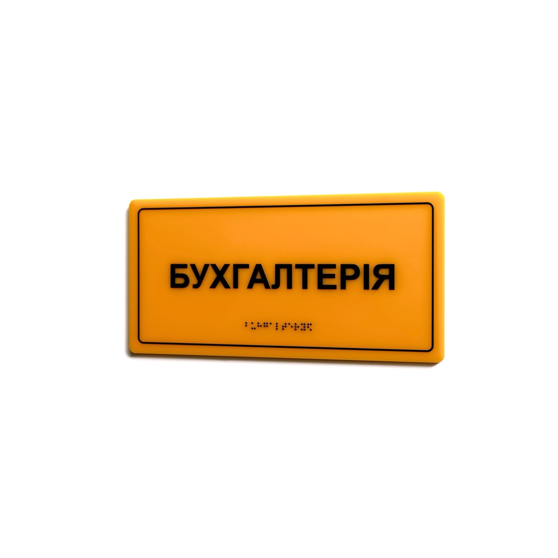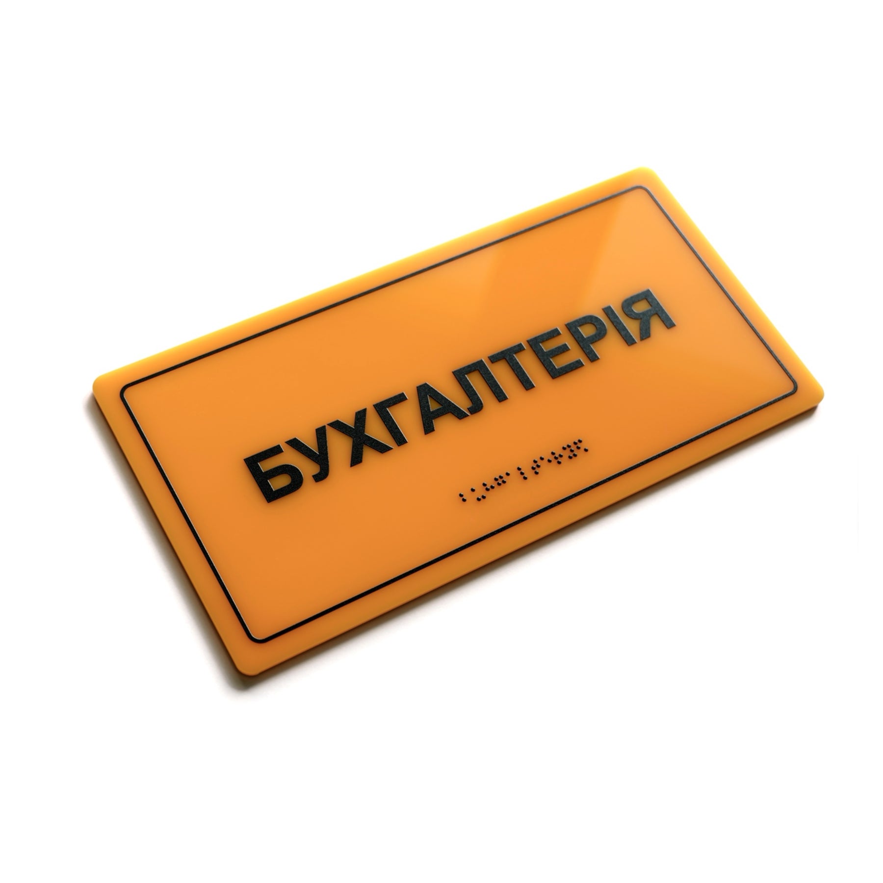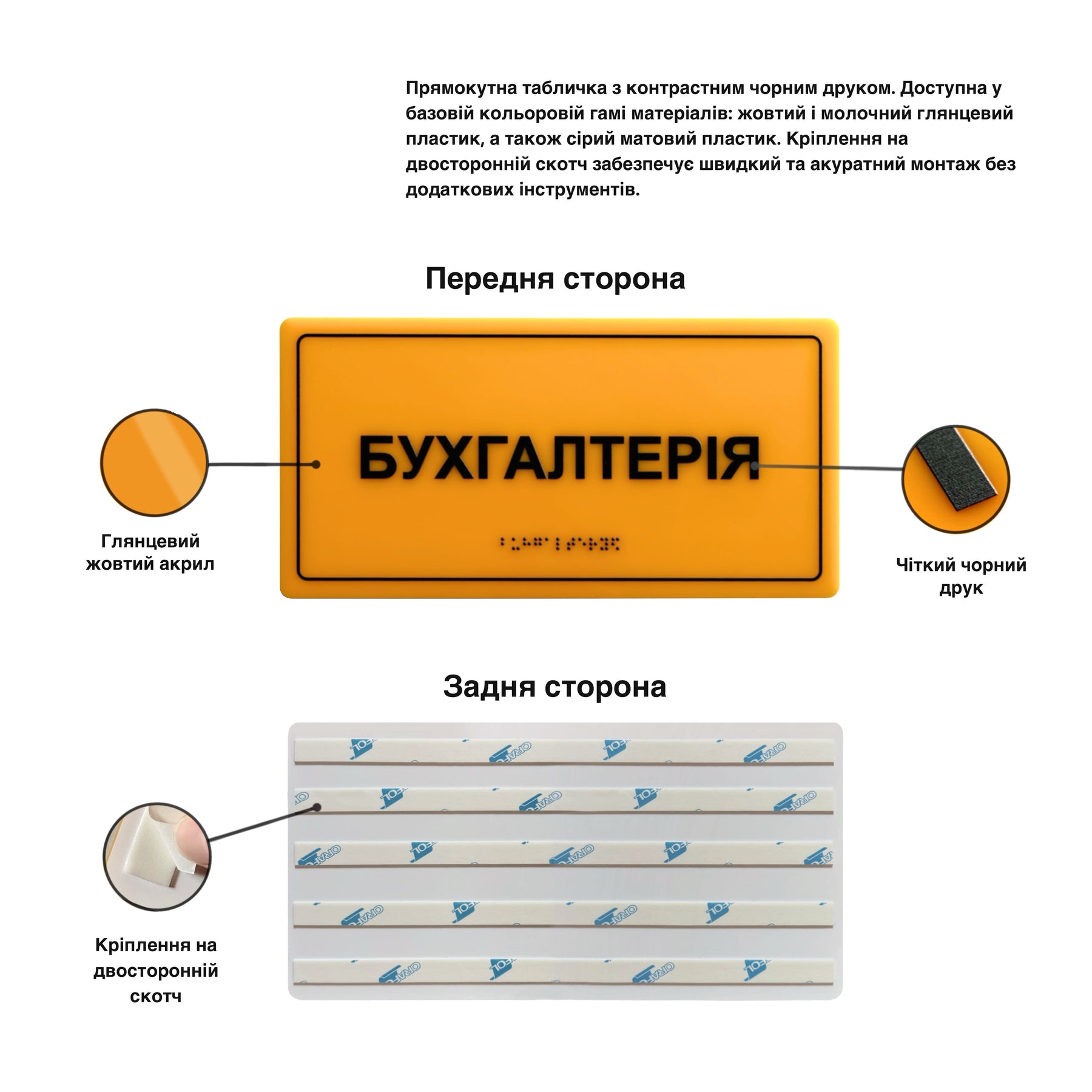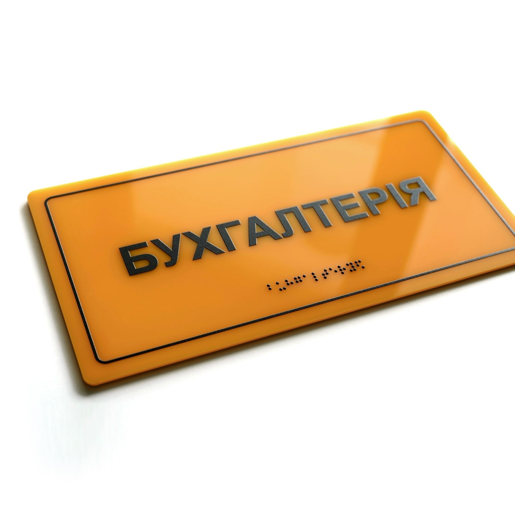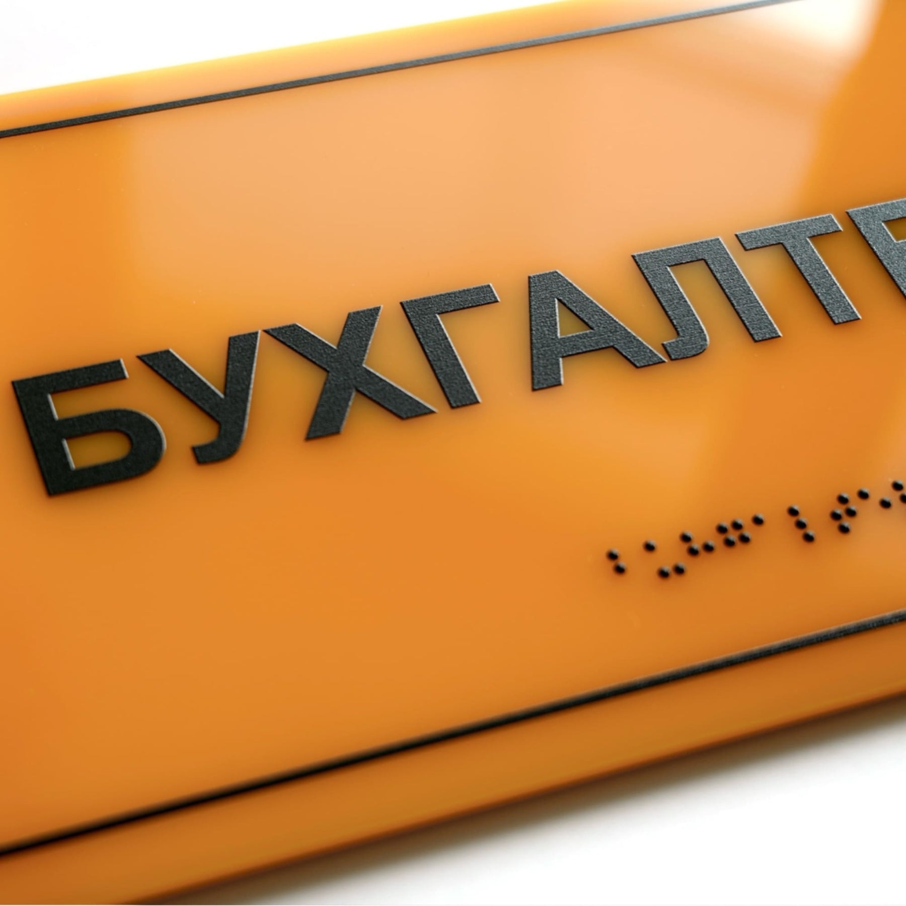 Акриловая табличка «Бухгалтерия» со шрифтом Брайля предназначена для обозначения финансовых отделов, касс и административных кабинетов в офисах, бизнес-центрах и коммерческих помещениях.