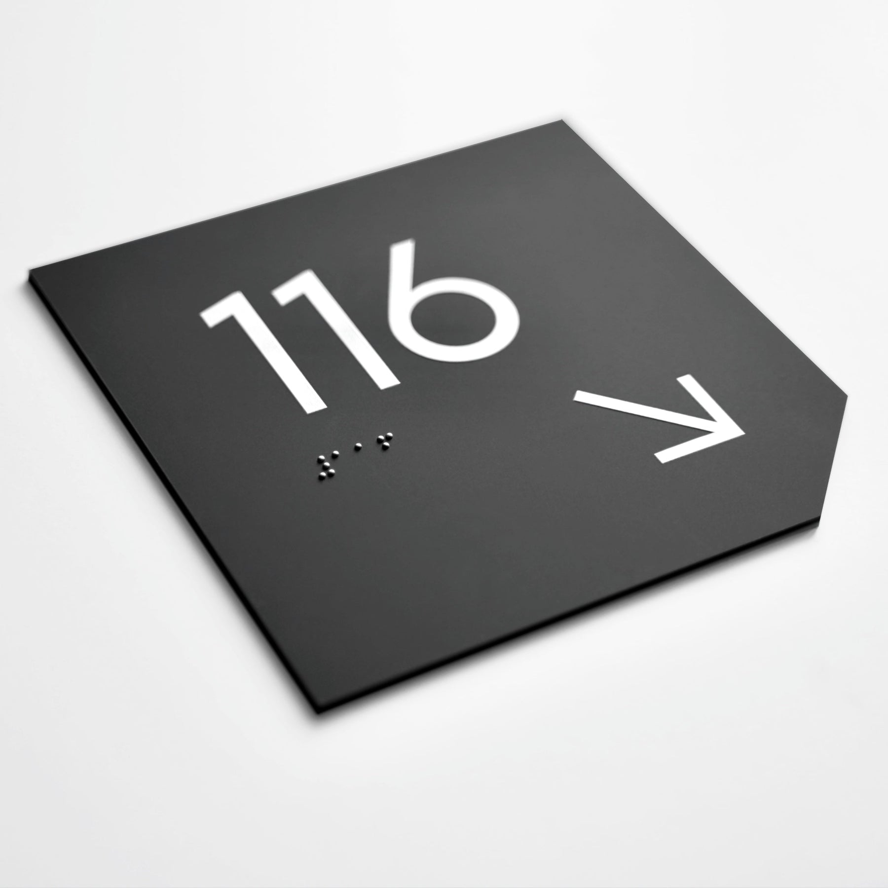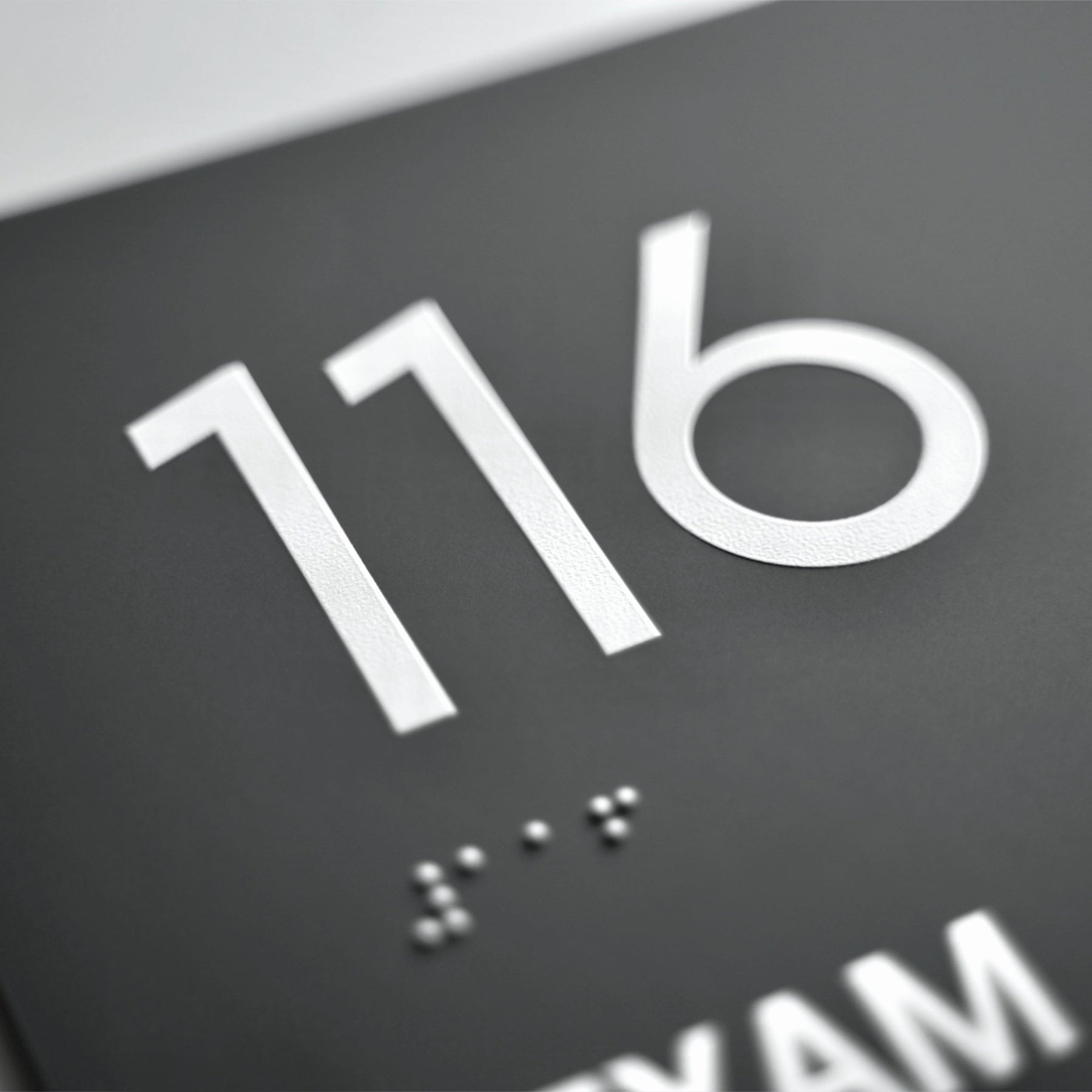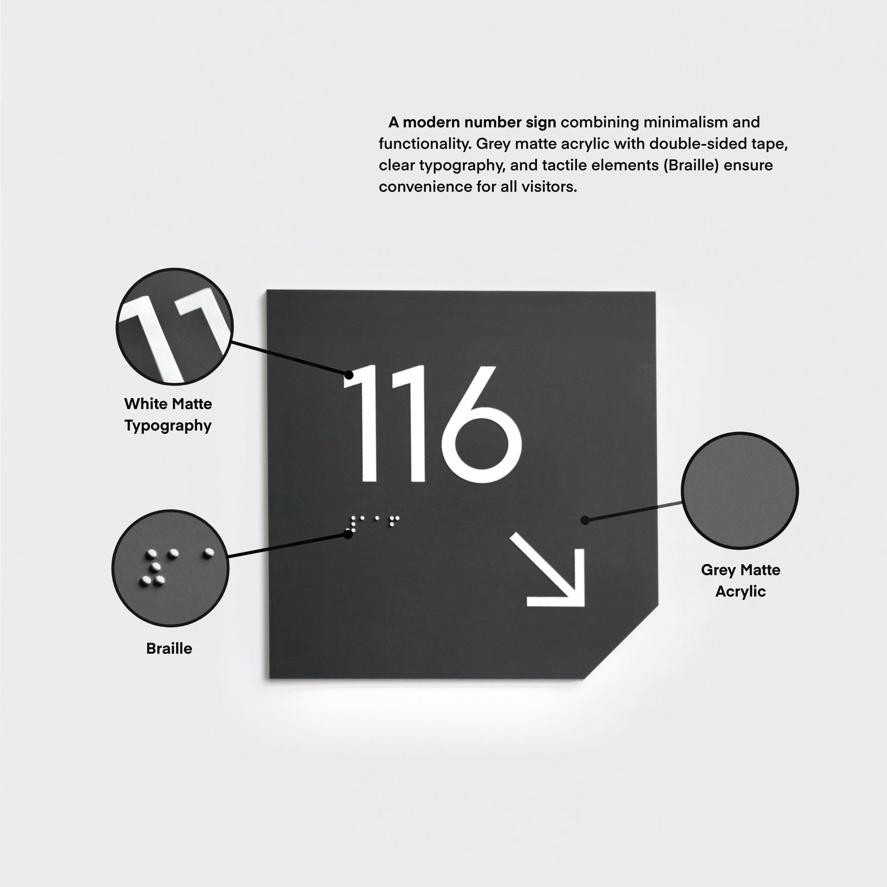 Табличка изготовлена из двух слоёв акрила: матовой серой основы и белых рельефных цифр, создающих высококонтрастный эффект и превосходную читаемость. Конструкция легко устанавливается с помощью двустороннего скотча, без необходимости сверления. По запросу доступен шрифт Брайля.